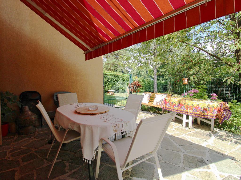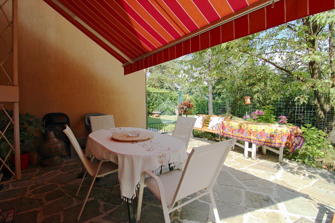 Dal soggiorno si accede a un grazioso portico coperto, dotato di nuova tenda da sole, perfetto per pranzi all’aperto o serate di relax immersi nella tranquillità.