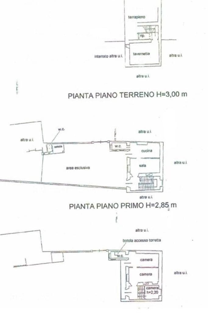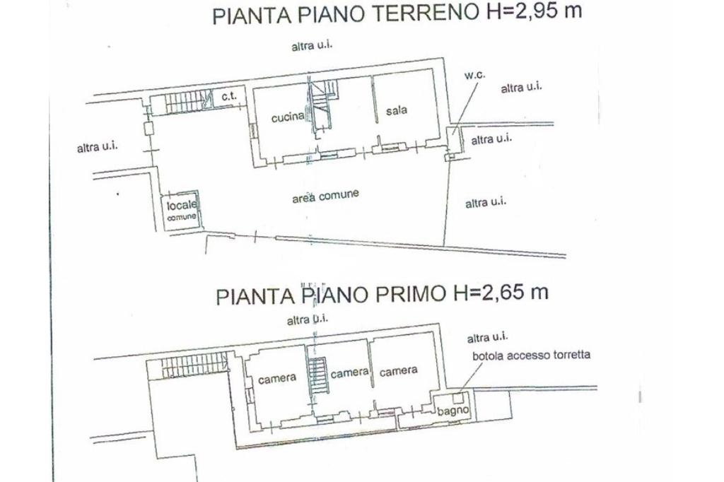 Al piano terra ingresso su disimpegno che ci porta alla zona giorno composta da soggiorno con camino, cucina abitabile e bagno finestrato. Tramite scala posta all'ingresso si raggiunge il piano primo con due camere da letto con fuoriuscita sul balcone, studiolo e bagno finestrato, da cui si accede alla torretta finestrata tramite botola.
