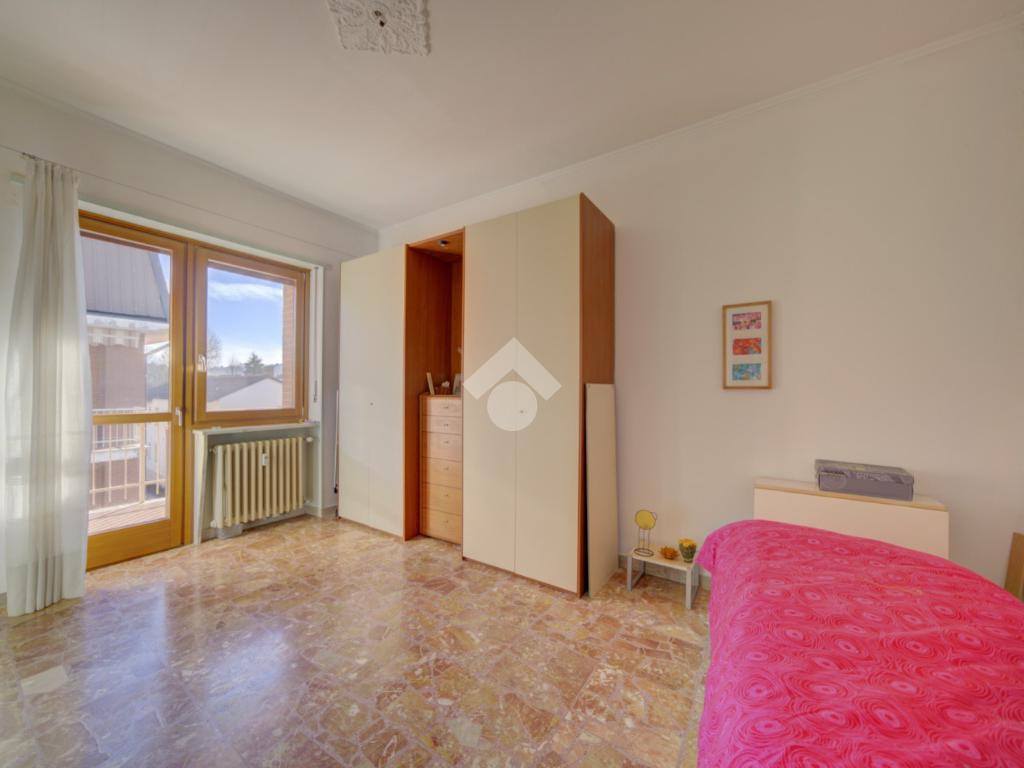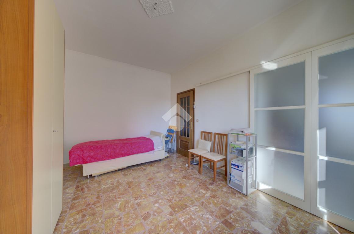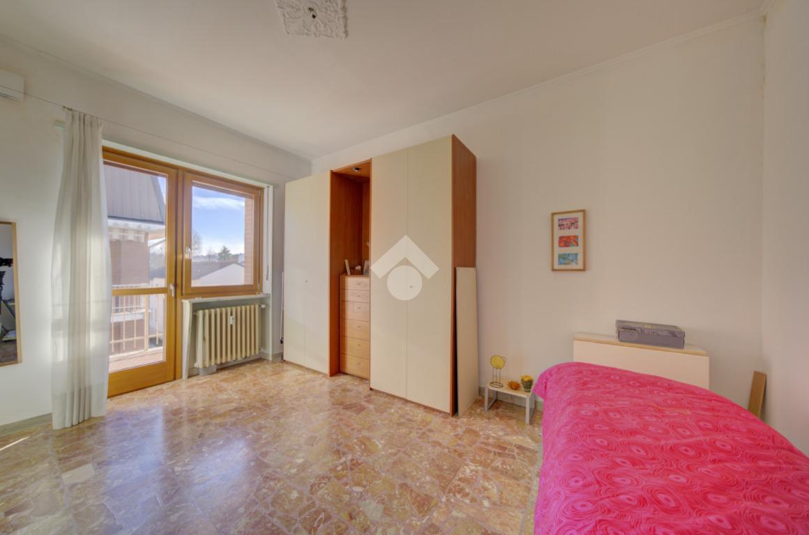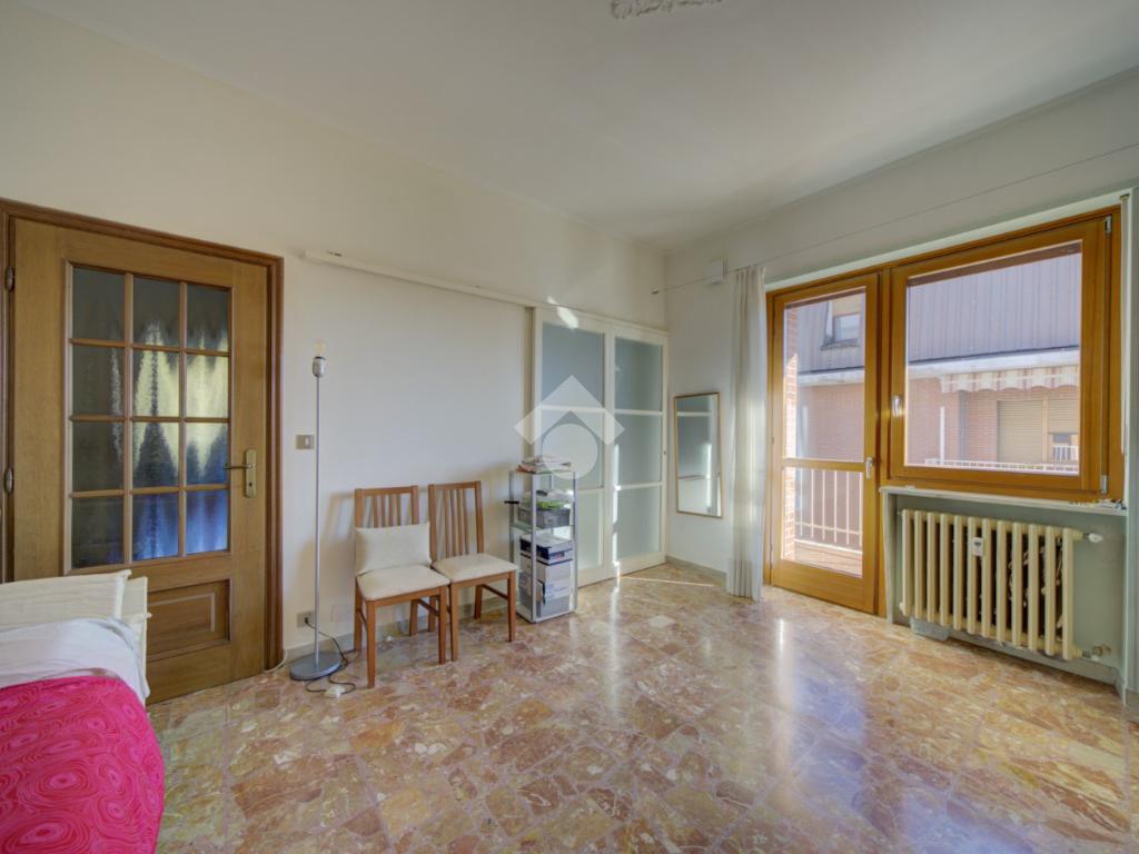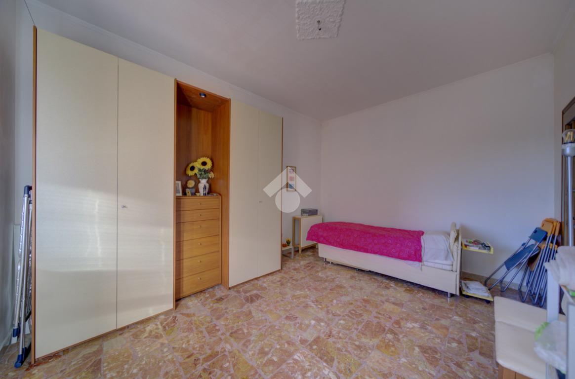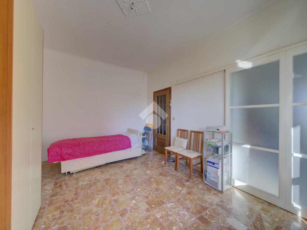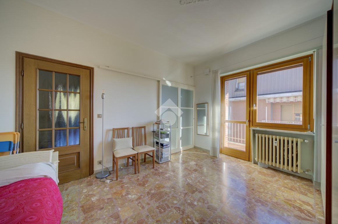 La camera da letto, anch’essa con affaccio sul balcone, mantiene una buona continuità tra zona giorno e zona notte.