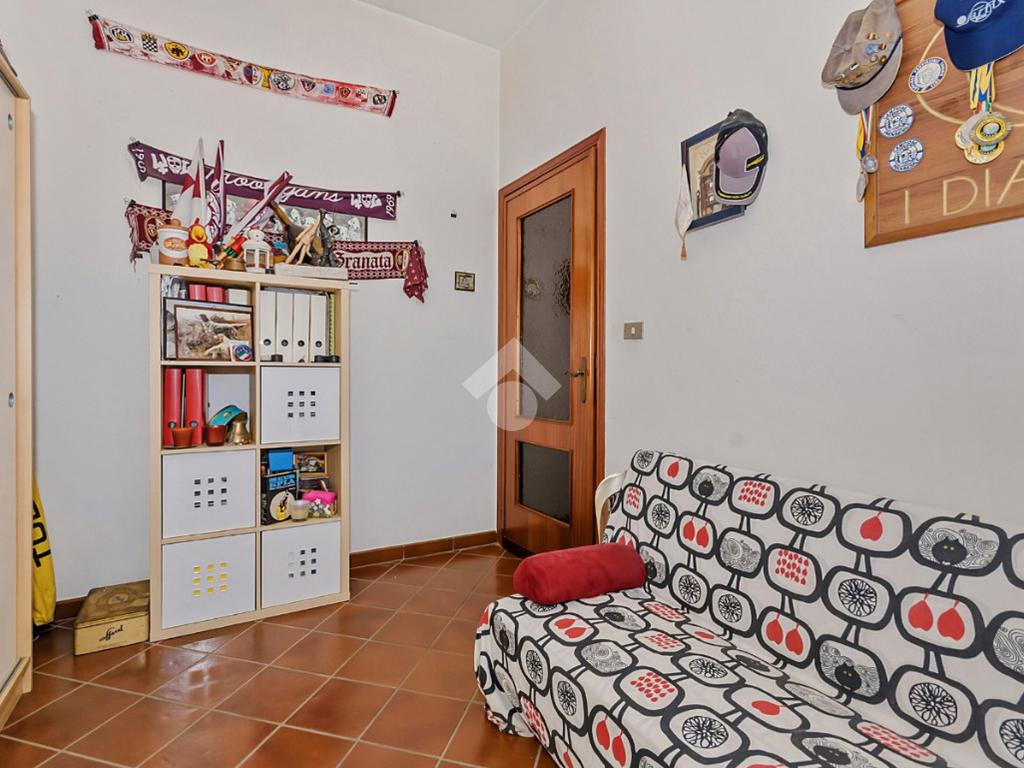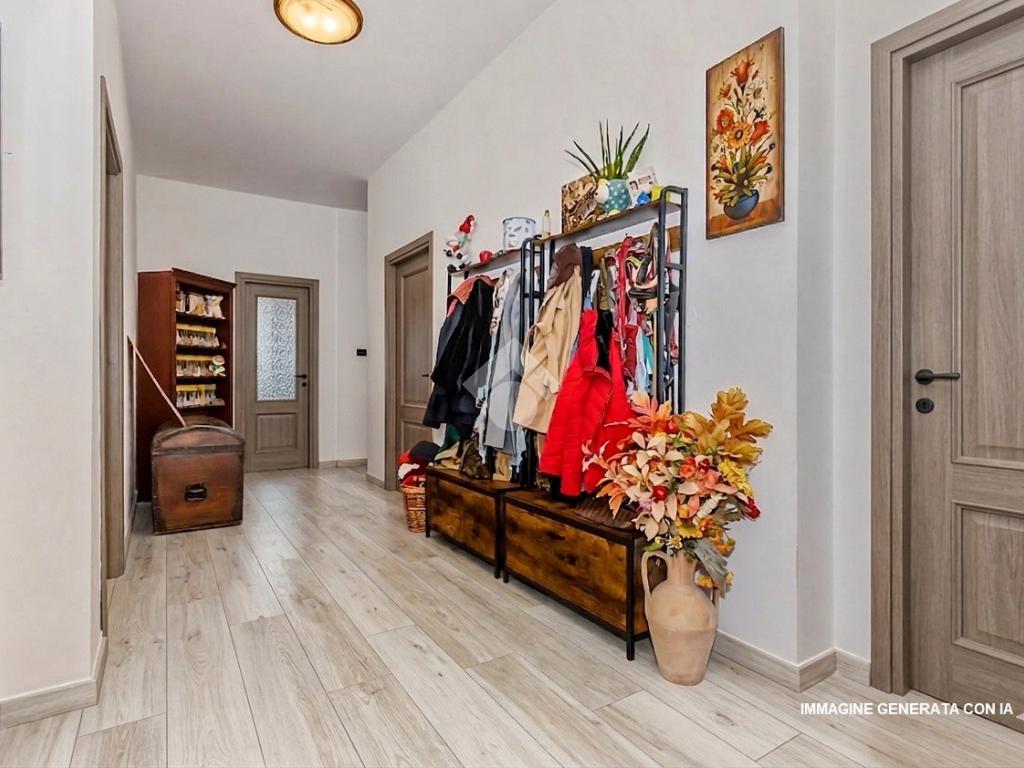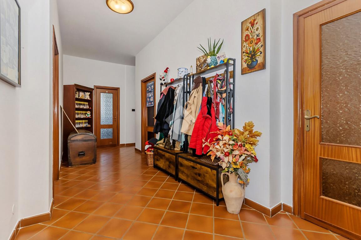 L’ingresso conduce a un comodo disimpegno che accompagna ai vari ambienti. La zona notte offre tre camere da letto spaziose, tra cui una matrimoniale con accesso a un grande terrazzo privato. I bagni sono due, entrambi completi, e uno è stato recentemente ristrutturato.